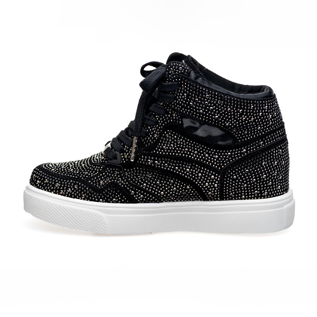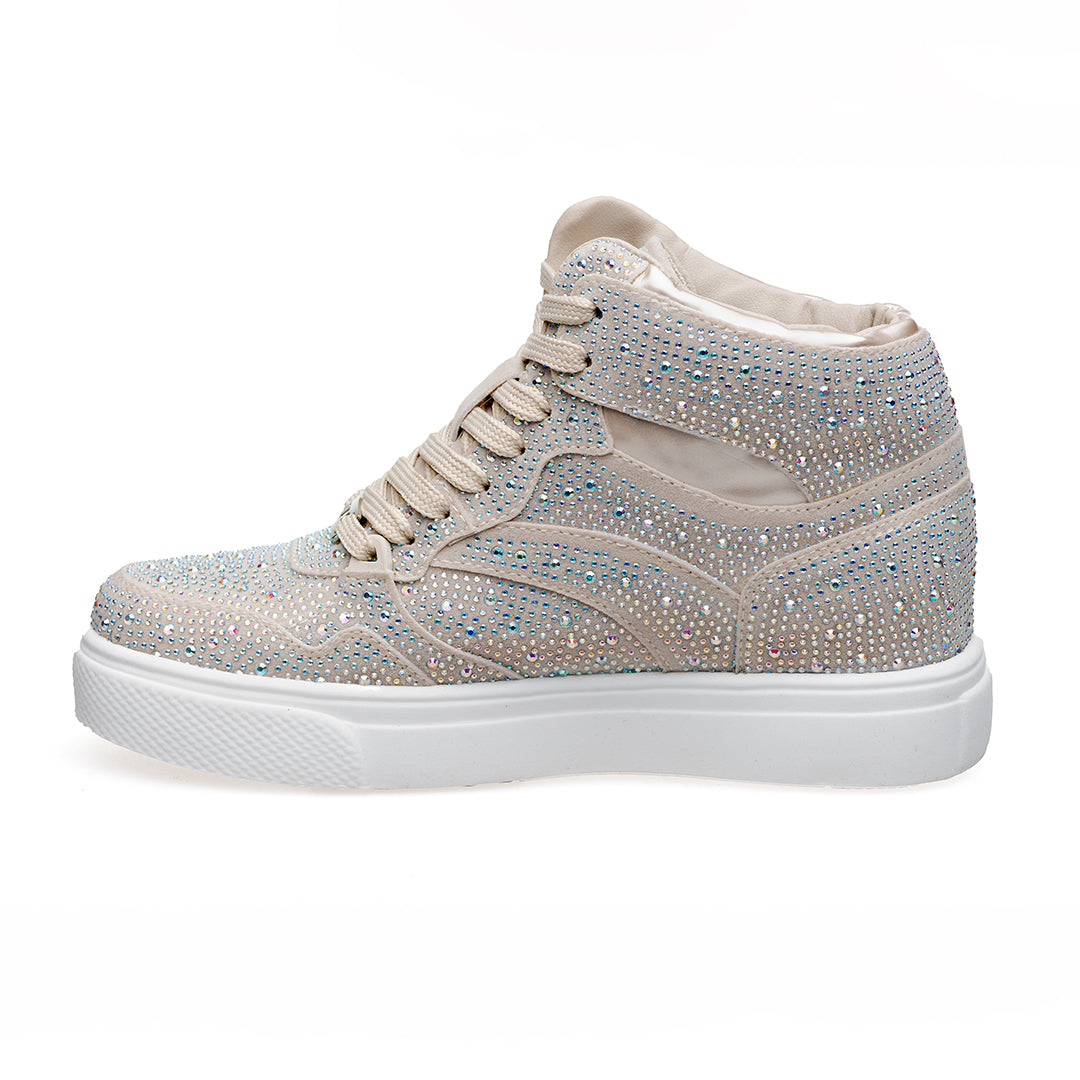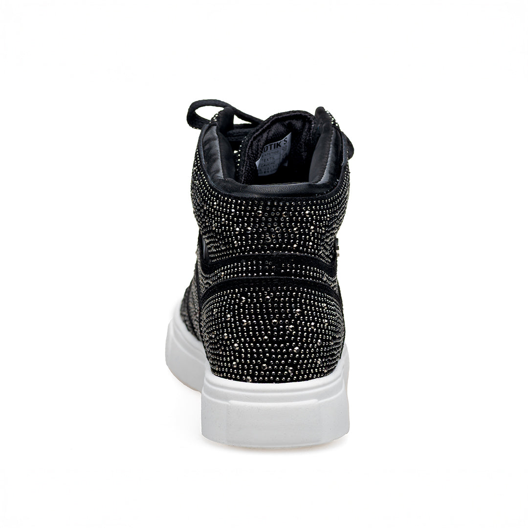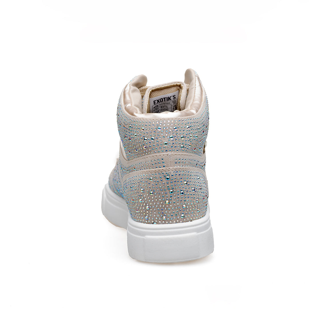 Diseñada para destacar. Fabricada en 100% carnaza y cubierta con pedrería termofijada, ofrece un brillo sofisticado y elegante. Los cortes laterales estilizan la silueta, mientras los herrajes y punteras metalizadas añaden ese toque glamuroso y moderno.