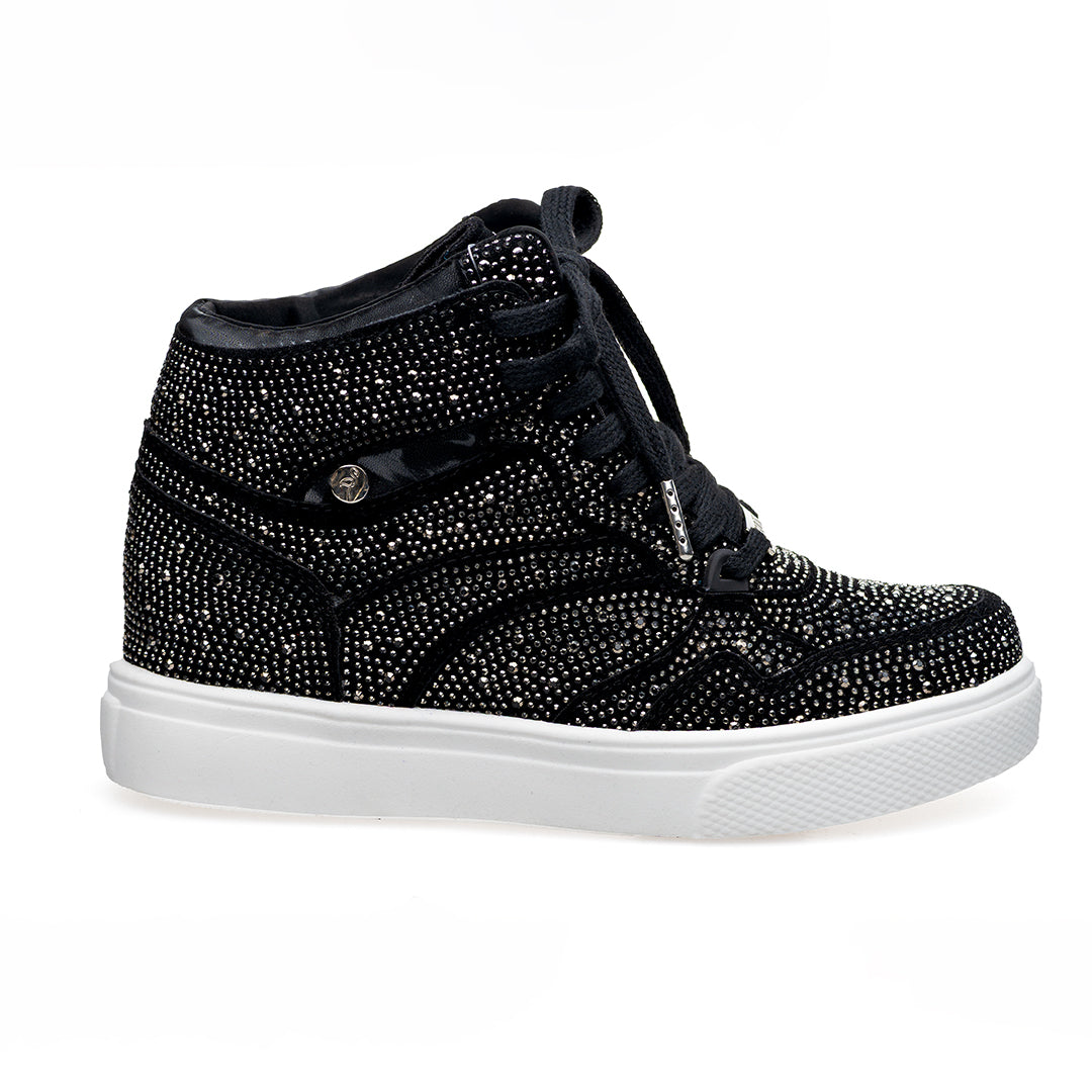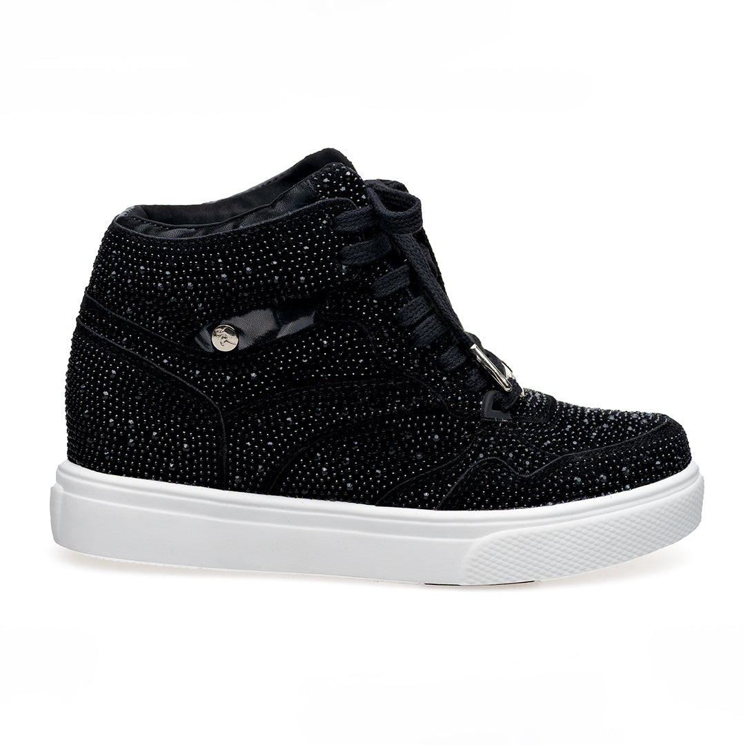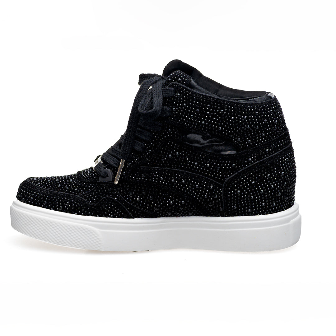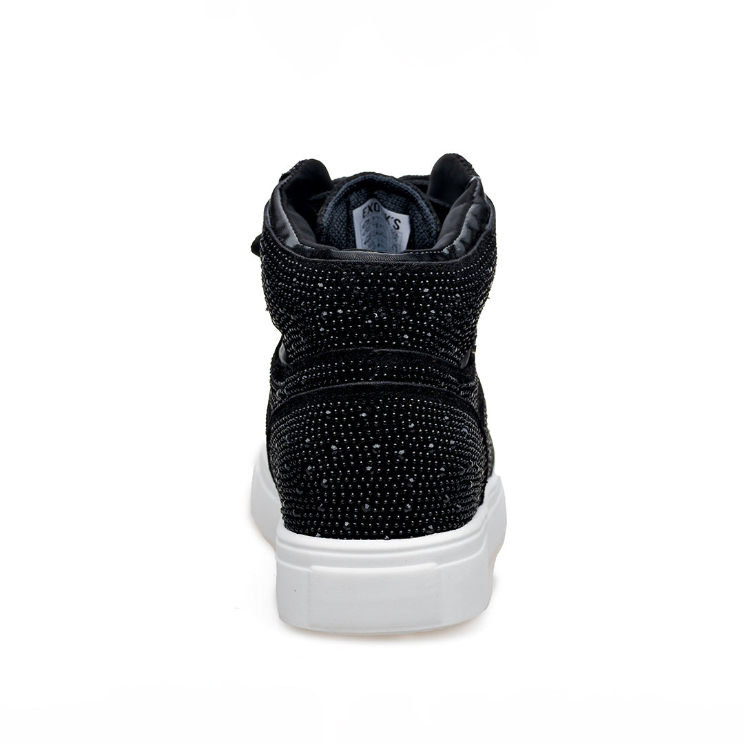 Diseñada para destacar. Fabricada en 100% carnaza y cubierta con pedrería termofijada, ofrece un brillo sofisticado y elegante. Los cortes laterales estilizan la silueta, mientras los herrajes y punteras metalizadas añaden ese toque glamuroso y moderno.